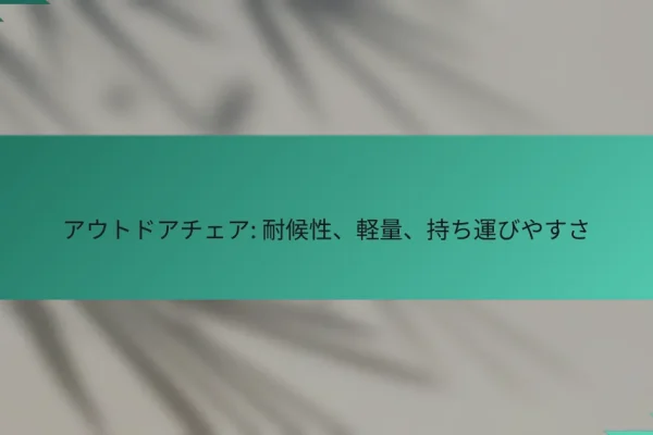アウトドアチェアは、耐候性、軽量性、持ち運びやすさが重要な要素です。雨や紫外線に強い素材で作られたこれらのチェアは、キャンプやピクニックに最適で、さまざまな環境で快適に使用できます。軽量でコンパクトなデザインは、移動を楽にし、アウトドア活動をより楽しむことができます。 アウトドアチェアの耐候性とは何か? アウトドアチェアの耐候性とは、様々な気象条件に耐える能力を指します。雨や紫外線、風などの影響を受けにくい素材や設計が求められます。 耐候性の定義と重要性 耐候性は、製品が外部環境にどれだけ耐えられるかを示す指標です。特にアウトドアチェアでは、長時間の使用や保管中に劣化しないことが重要です。 耐候性が高いチェアは、使用寿命が延びるだけでなく、快適な使用体験を提供します。悪天候でも安心して使用できるため、キャンプやバーベキューなどのアウトドア活動に適しています。 使用される素材とその特性 耐候性の高いアウトドアチェアには、主にアルミニウム、プラスチック、合成繊維などの素材が使用されます。これらの素材は、軽量でありながら強度があり、腐食や紫外線に強い特性を持っています。 例えば、アルミニウム製のフレームは軽量で持ち運びやすく、プラスチック製の座面は水や汚れに強いです。合成繊維は通気性があり、快適さを保ちながらも耐久性があります。 耐候性の評価基準 アウトドアチェアの耐候性は、主に防水性、UV耐性、耐風性などの基準で評価されます。防水性は、雨の中でも水が浸透しないことを示し、UV耐性は日光による劣化を防ぎます。 これらの基準は、製品の仕様書やラベルに記載されていることが多く、購入時に確認することが重要です。特に、UV耐性は長時間の使用において特に重要です。 耐候性が必要なシチュエーション 耐候性が求められるシチュエーションには、キャンプ、ビーチ、バーベキュー、ピクニックなどがあります。これらの活動では、天候が変わりやすく、耐候性が高いチェアが必要です。 特に、雨が降る可能性がある場合や直射日光の下での使用では、耐候性の高いチェアを選ぶことで、快適さと安全性を確保できます。 耐候性のメンテナンス方法 耐候性を維持するためには、定期的なメンテナンスが必要です。使用後は、汚れを軽く拭き取ることで、素材の劣化を防ぎます。 また、長期間使用しない場合は、直射日光を避けて保管することが推奨されます。カバーを使用することで、さらに劣化を防ぐことができます。 軽量なアウトドアチェアの利点は何か? 軽量なアウトドアチェアは、持ち運びが簡単で、キャンプやピクニックに最適です。これらのチェアは、耐候性があり、さまざまな環境で使用できるため、アウトドア活動において非常に便利です。 軽量素材の種類と特徴 軽量なアウトドアチェアには、アルミニウム、カーボンファイバー、ナイロンなどの素材が使用されます。アルミニウムは耐久性があり、腐食に強い特性がありますが、カーボンファイバーはさらに軽量で、強度も高いです。 ナイロンは、軽量でありながら、耐水性や耐久性も兼ね備えています。これらの素材は、持ち運びの際の負担を軽減し、快適な使用体験を提供します。 持ち運びやすさの評価基準 持ち運びやすさを評価する際は、重量、折りたたみのしやすさ、収納サイズが重要です。一般的に、1kg未満のチェアは非常に軽量とされ、持ち運びが容易です。 また、折りたたみ式のデザインは、収納時のスペースを節約し、バックパックや車のトランクに簡単に収まります。これにより、アウトドア活動の際に便利さが増します。 軽量性がもたらす利便性 軽量なアウトドアチェアは、移動が頻繁なアクティビティに最適です。例えば、ハイキングやフェスティバルでは、軽量なチェアがあれば、疲れにくく、快適に過ごせます。 さらに、軽量なデザインは、設置や撤収も簡単に行えるため、時間を節約できます。これにより、より多くの時間を楽しむことができます。 軽量チェアのデメリット 軽量なアウトドアチェアは、耐荷重が限られている場合があります。特に、非常に軽量なモデルは、重い人や長時間の使用には向かないことがあります。 また、軽量素材は、耐久性が劣ることがあるため、過酷な環境での使用には注意が必要です。選ぶ際には、使用目的に応じた強度や耐久性を確認することが重要です。 持ち運びやすいアウトドアチェアの選び方は? 持ち運びやすいアウトドアチェアを選ぶ際は、軽量性、コンパクトさ、耐候性を重視することが重要です。これらの要素が揃っていると、移動が楽になり、さまざまな環境で快適に使用できます。 持ち運びやすさの重要な要素 持ち運びやすさを考えると、まずは重量が大きな要素です。一般的に、1kg未満のチェアが理想的で、長時間の移動でも負担になりません。 次に、折りたたみ機能や収納サイズも重要です。折りたたみ式のチェアは、カバンや
