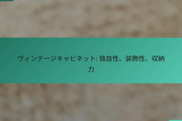 ヴィンテージキャビネットは、独特のデザインと歴史的背景を持つ収納家具で、個性を引き立てる要素が豊富です。装飾性と機能性を兼ね備えたこれらのキャビネットは、空間に独自の魅力を加え、さまざまなアイテムを整理するのに最適です。 ヴィンテージキャビネットの独自性とは何か? ヴィンテージキャビネットは、独特のデザインと歴史的背景を持つ収納家具であり、個性を引き立てる要素が満載です。これらのキャビネットは、装飾性と機能性を兼ね備え、空間に独自の魅力を加えます。 デザインの特徴とスタイル ヴィンテージキャビネットは、時代ごとのデザインスタイルを反映しています。例えば、アールデコやミッドセンチュリーのスタイルは、特有のラインや装飾が特徴です。 これらのキャビネットは、色彩や形状においても多様性があり、どんなインテリアにも調和しやすいです。選ぶスタイルによって、部屋の雰囲気を大きく変えることができます。 素材の選択とその影響 ヴィンテージキャビネットは、木材や金属、ガラスなど多様な素材で作られています。特に、無垢材を使用したキャビネットは耐久性が高く、長年にわたって使用できます。 素材によって、見た目や質感が異なるため、選択する際はインテリア全体との調和を考慮することが重要です。例えば、重厚感のあるオーク材は、クラシックな雰囲気を演出します。 歴史的背景と文化的意義 ヴィンテージキャビネットは、特定の時代や文化を反映した家具です。例えば、20世紀初頭のキャビネットは、当時の社会的背景や技術革新を示しています。 これらのキャビネットは、単なる収納家具以上の意味を持ち、歴史的な価値や文化的な意義を持つことが多いです。購入する際には、その背景を理解することで、より深い愛着が湧きます。 他の家具との違い ヴィンテージキャビネットは、一般的な現代家具とは異なり、独自のストーリーや個性を持っています。新しい家具は均一なデザインが多いですが、ヴィンテージキャビネットはそれぞれにユニークな特徴があります。 また、これらのキャビネットは、時に修復やリメイクが施されており、個々の歴史を持つことが魅力の一部です。これにより、他の家具と差別化され、特別な存在感を放ちます。 個性を引き立てるカスタマイズ ヴィンテージキャビネットは、カスタマイズが可能で、個性を引き立てる手段としても利用されます。例えば、塗装やハードウェアの変更により、全く異なる印象を与えることができます。 さらに、内部の収納スペースを調整することで、使い勝手を向上させることも可能です。自分のライフスタイルに合わせたカスタマイズを行うことで、より愛着の湧く家具になります。 ヴィンテージキャビネットの装飾性はどのように評価されるか? ヴィンテージキャビネットの装飾性は、そのデザイン、素材、仕上げによって評価されます。独特のスタイルや歴史的な背景が、インテリアに個性を加え、視覚的な魅力を高めます。 装飾的要素の種類 ヴィンテージキャビネットには、彫刻、金属の装飾、ガラスの挿入など、さまざまな装飾的要素があります。これらの要素は、キャビネットのスタイルを際立たせ、視覚的な興味を引きます。 例えば、アールデコスタイルのキャビネットは、幾何学的なデザインや光沢のある仕上げが特徴です。一方、カントリースタイルのキャビネットは、ナチュラルな木材とシンプルな装飾が魅力です。 色彩と仕上げの選択肢 色彩と仕上げは、ヴィンテージキャビネットの印象を大きく左右します。一般的には、深い色合いやアンティーク仕上げが好まれ、温かみのある雰囲気を演出します。 例えば、ダークブラウンやオリーブグリーンのキャビネットは、クラシックなインテリアに調和しやすいです。仕上げには、マット、グロス、またはワックス仕上げなどがあり、それぞれ異なる質感と視覚効果を持っています。 装飾スタイルのトレンド 近年、ヴィンテージキャビネットの装飾スタイルには、ミッドセンチュリーやボヘミアンスタイルが人気です。これらのスタイルは、独自のデザイン要素やカラーパレットを持ち、個性的な空間を作り出します。 また、リサイクルやアップサイクルのトレンドも影響を与えており、古いキャビネットを新しいスタイルに再生することが注目されています。 空間に与える視覚的影響 ヴィンテージキャビネットは、空間に独特のキャラクターを与え、他の家具とのコントラストを生み出します。特に、モダンなインテリアにヴィンテージの要素を加えることで、深みと興味を持たせることができます。 また、キャビネットの配置や色彩は、部屋の雰囲気を変える重要な要素です。明るい色のキャビネットは空間を広く見せ、暗い色は落ち着いた印象を与えます。 ヴィンテージキャビネットの収納力はどのくらいか? ヴィンテージキャビネットは、一般的に多様な収納力を持ち、さまざまなサイズや